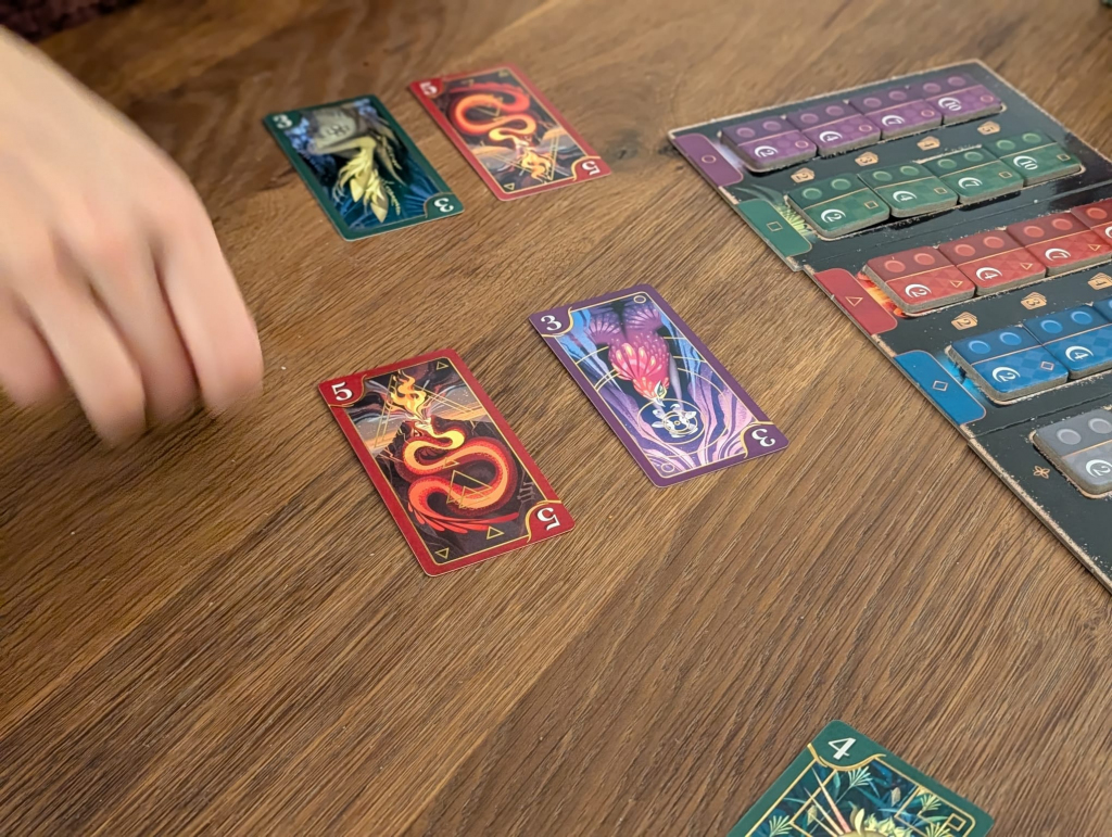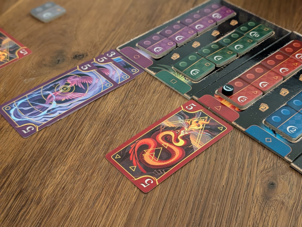Mais comment on joue alors ? Le principe est assez simple : le jeu comporte des cartes de créatures mythologiques, réparties selon les 4 éléments (Feu, Eau, Terre, Air). Chaque élément/couleur comporte des cartes numérotées de 1 à 5, plus un joker, toutes disponibles en 2 exemplaires. Au début de la partie, le premier joueur va retourner 3 cartes sur la pioche. Il a alors la possibilité de mettre dans sa collection toutes les cartes d’une même couleur (si vous avez retourné 3 rouges feu, vous êtes un petit veinard !). Les autres cartes vont aller se positionner sous le plateau de jeu, dans la réserve. A sa suite, le second joueur va avoir un choix : soit retourner lui aussi 3 cartes, et procéder de la même manière, soit aller récupérer toutes les cartes d’une même couleur dans la réserve, et les ajouter à sa collection. Attention, si vous récupérez un doublon, vous devez immédiatement le donner à votre adversaire.