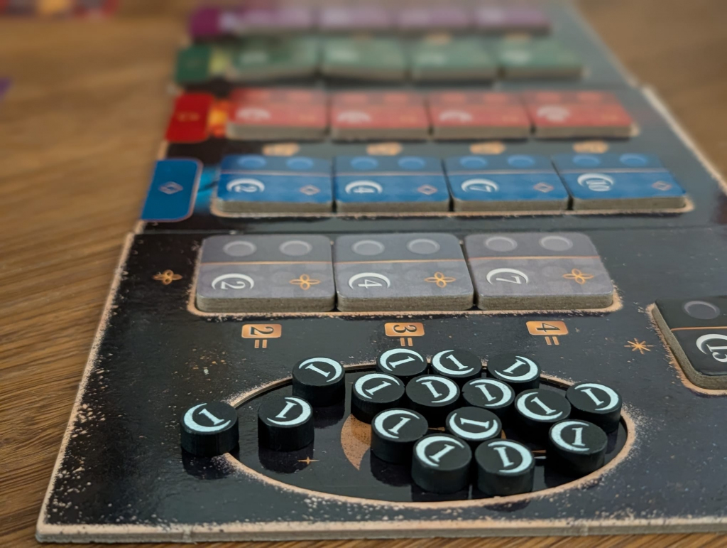 Enfin, autre aspect stratégique : à la fin de chaque tour, vous avez également la possibilité de venir « renforcer » l’un des marqueurs que vous espérez récupérer ensuite, avec 1 ou 2 points bonus. De même, si vous voyez que votre adversaire vise une combinaison particulière, vous allez pouvoir venir « verrouiller » ce marqueur pour l’empêcher de le booster à l’avenir avec des points bonus. Il va falloir être malin, et attentif ! Chaque joueur joue jusqu’à ce la carte « lever du jour » apparaisse dans la pioche, quelque part parmi les 9 dernières cartes du jeu, ce qui apporte son petit lot d’incertitude.